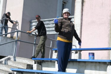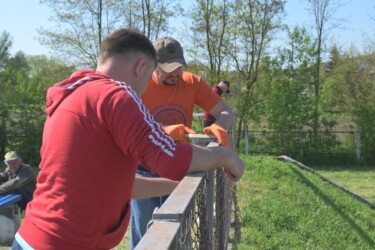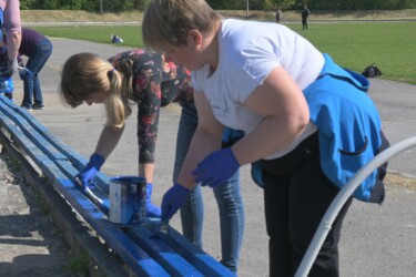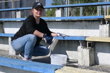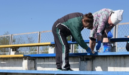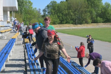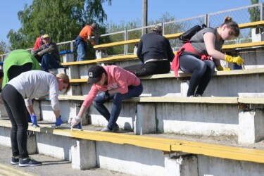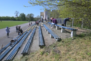 Прибирали від сміття територію стадіону та безпосередньо зону для вболівальників на трибунах. Провели вирубку чагарників та застарілих дерев, пофарбували у патріотичні кольори лавки та побілили трибуни вболівальників.