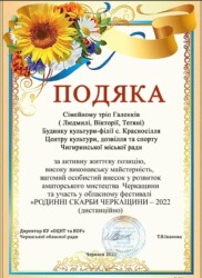 За участь у дистанційному фестивалі “РОДИННІ СКАРБИ ЧЕРКАЩИНИ – 2022” відзначили Подякою родинне тріо Галенків – мама Людмила та дочки Вікторія і Тетяна, Будинку культури-філії с. Красносілля.